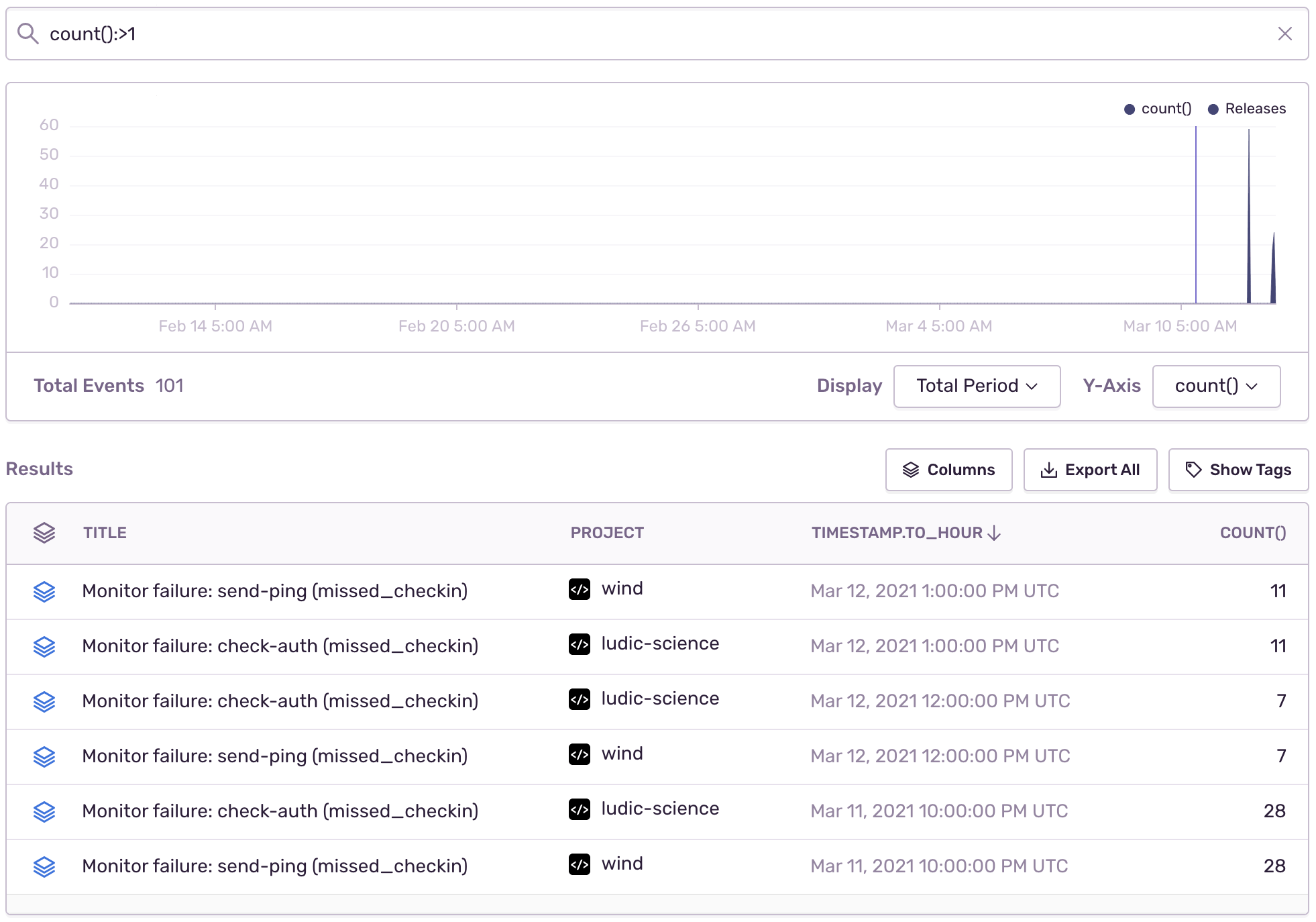 value of Mar 12, 2021 12:00:00 AM UTC. This allows you to group events. For example, you can show hourly hit counts for errors hit at least twice per hour: